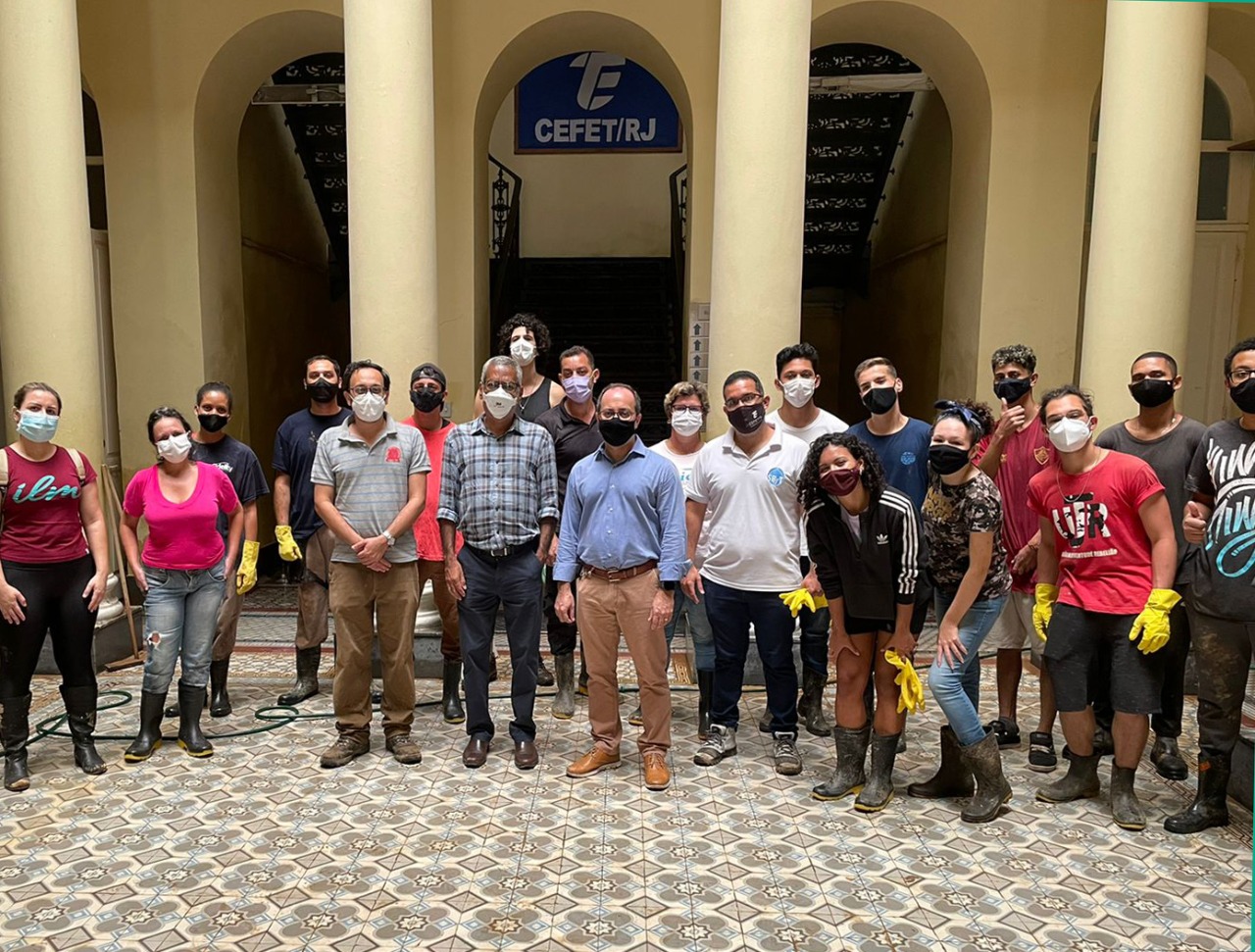 Diretores do Cefet/RJ acompanhados de voluntários que estão atuando na limpeza da Uned Petrópolis.