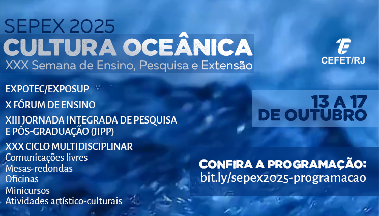 A Diretoria de Extensão (DIREX) do Cefet/RJ, por meio do Departamento de Extensão e Assuntos Comunitários (DEAC), divulga a programação da Semana de Ensino, Pesquisa e Extensão (Sepex) 2025. O evento contará com palestras, oficinas, minicursos, atividades artístico-culturais e exposições de projetos e pesquisas em todas as unidades da instituição. A Sepex 2025 acontecerá entre os dias 13 e 17 de outubro e abordará a “Cultura Oceânica”, acompanhando a temática da Semana Nacional de Ciência e Tecnologia (SNCT).